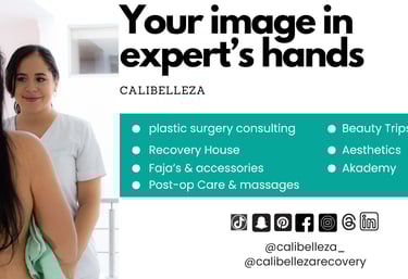 En Calibelleza, nos especializamos en asesoria y cuidados postoperatorios personalizados para procesos estéticos a través de fronteras. Desde viajes de belleza hasta suministros postoperatorios cuidadosamente seleccionados, ofrecemos a clientes internacionales apoyo experto — incluyendo acceso a una casa de recuperacion, tratamientos avanzados de cuidados post-operatorios y orientación personalizada en cada paso de su proceso de recuperación. Con un enfoque en la estética, el bienestar y los resultados, Calibelleza es su nombre de confianza en el cuidado estético postoperatorio a nivel global.